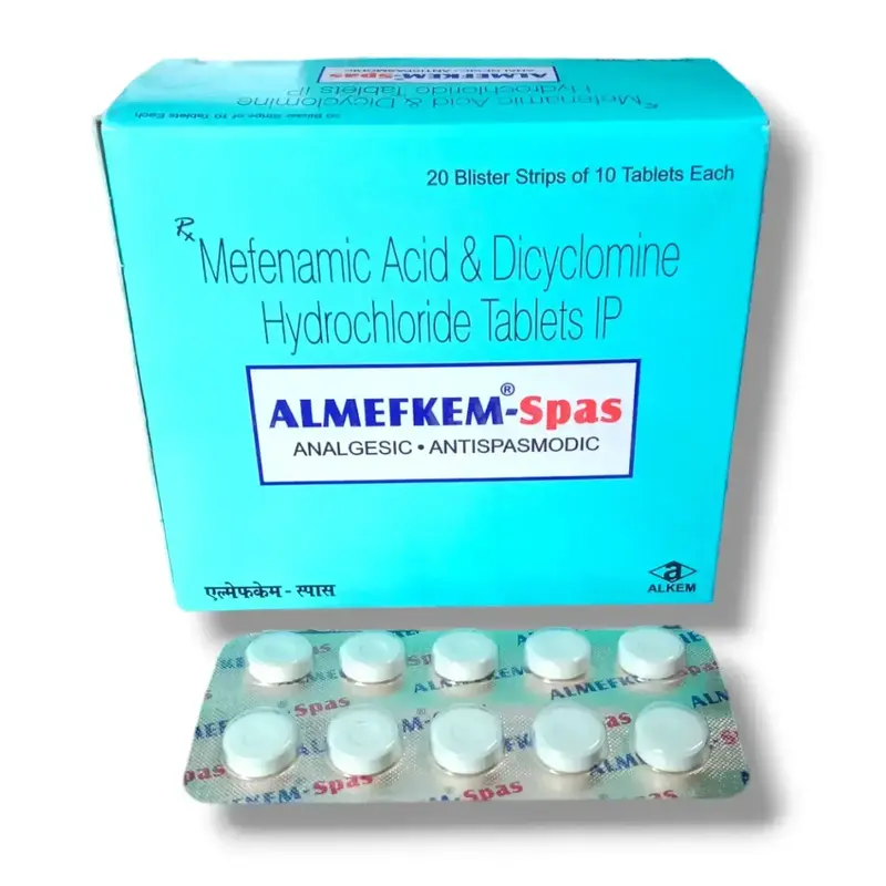 Almefkem Spas 10mg/250mg Tablet is a prescription medicine that helps to provide symptomatic relief from menstrual (period-related) pain and cramps. It is also used to treat abdominal pain by relieving spasms of the muscles in the stomach and intestines.